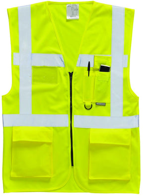 100% knitted polyester. Deeper arm holes. Scooped sides allowing pocket access. ID pocket. Mobile phone pocket. 2 front bellowed storage pockets. Double pen pocket with D ring. Front zip fastener. Retromax level 2 reflective tape.
