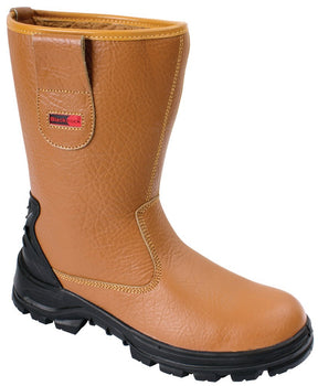 Steel toe cap and protective midsole. Water resistant uppers with triple stitch for extra strength. Fur lined. Kick plate heel. Energy absorbing cushioned heel to reduce foot fatigue. Fuel oil resistant sole. Anti-static sole. Double density PU shock absorbent sole. Fully moulded and removable insole. Wide fitting for added comfort.