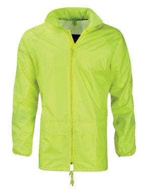 Lightweight nylon with PVC coating on inside. Zip front. Concealed hood. Lower front pockets with flap. Studded cuffs. Hip drawcord. Fully taped seams.