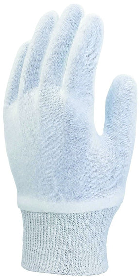 Knitted stockinette glove. Lightweight. Many and varied uses, light handling of dry product. Makes an excellent liner. Minimal risk.
